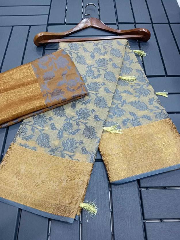 This graceful beige saree features delicate floral motifs woven in soft blue-grey tones, creating a serene and sophisticated look. The saree is beautifully complemented by an intricate gold zari border with fine traditional detailing, adding a touch of luxury and timeless charm. Crafted from smooth, lustrous silk, it offers an elegant drape and refined finish. Ideal for festive occasions, weddings, and formal gatherings, this saree pairs effortlessly with a contrasting blouse and classic jewelry for a polished, elegant ensemble.