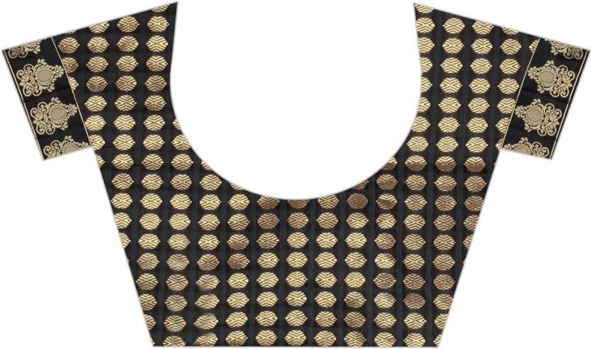 The Blouse: The ensemble is paired with a matching black blouse that features a gold polka-dot (butti) pattern and a coordinating zari border on the sleeves, echoing the traditional elements of the saree.